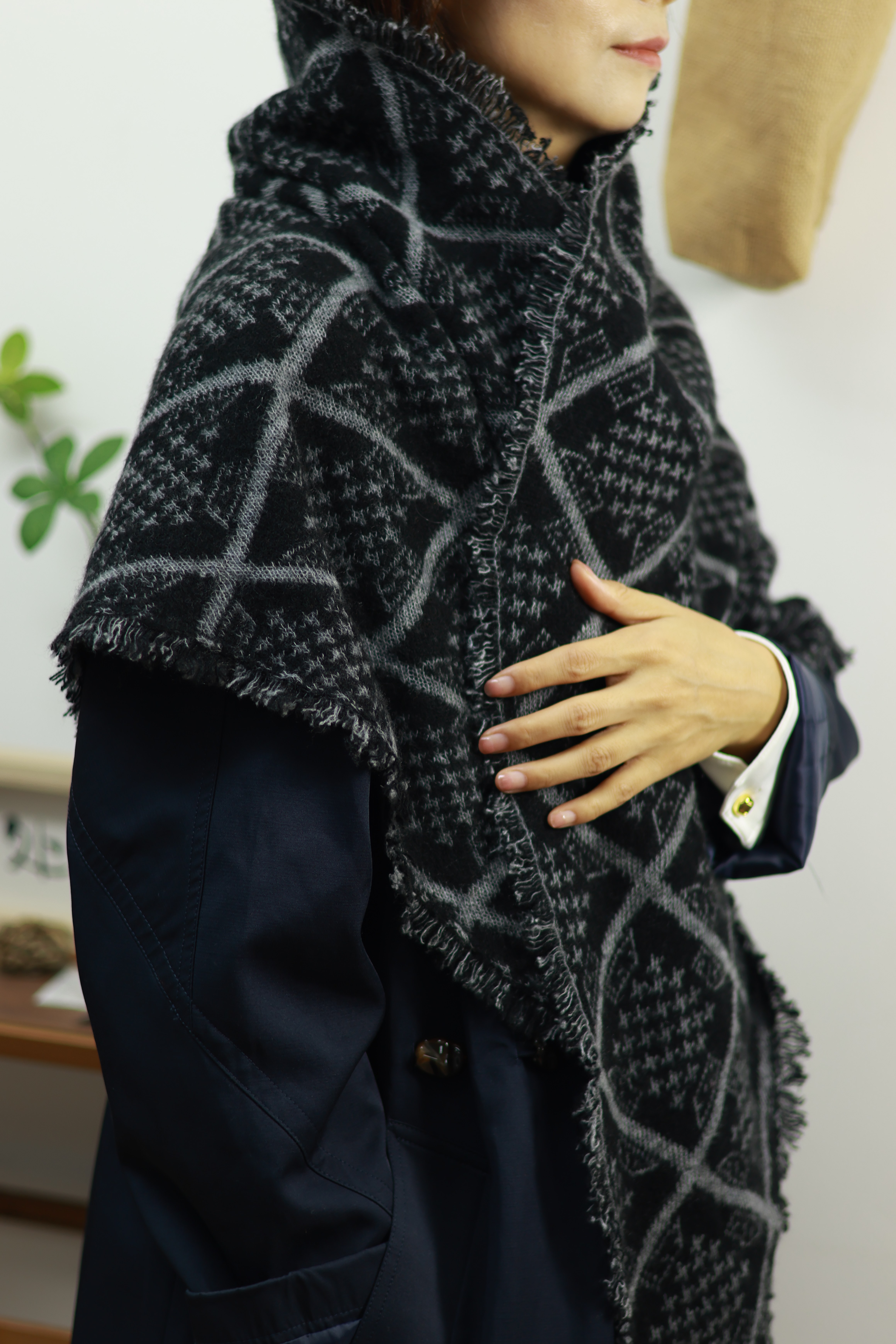 【LU】羊绒提花双面三角巾 厚实/保暖围巾披肩藏青黑色秋冬新款