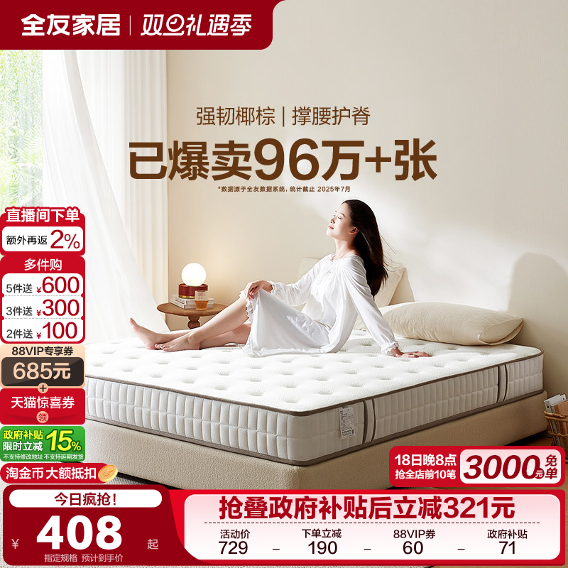 政府补贴全友家居席梦思弹簧床垫家用卧室椰棕硬垫床垫子180x200
