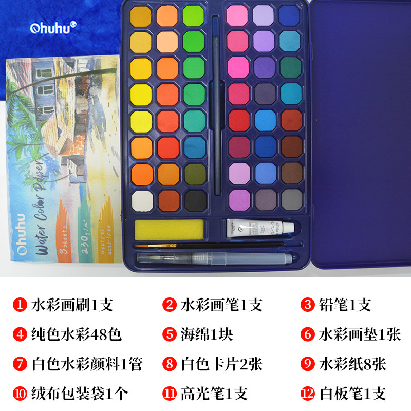 推荐理由:Ohuhu48色固体水彩颜料套装 18件套初学者手绘便携组合绘画工具儿