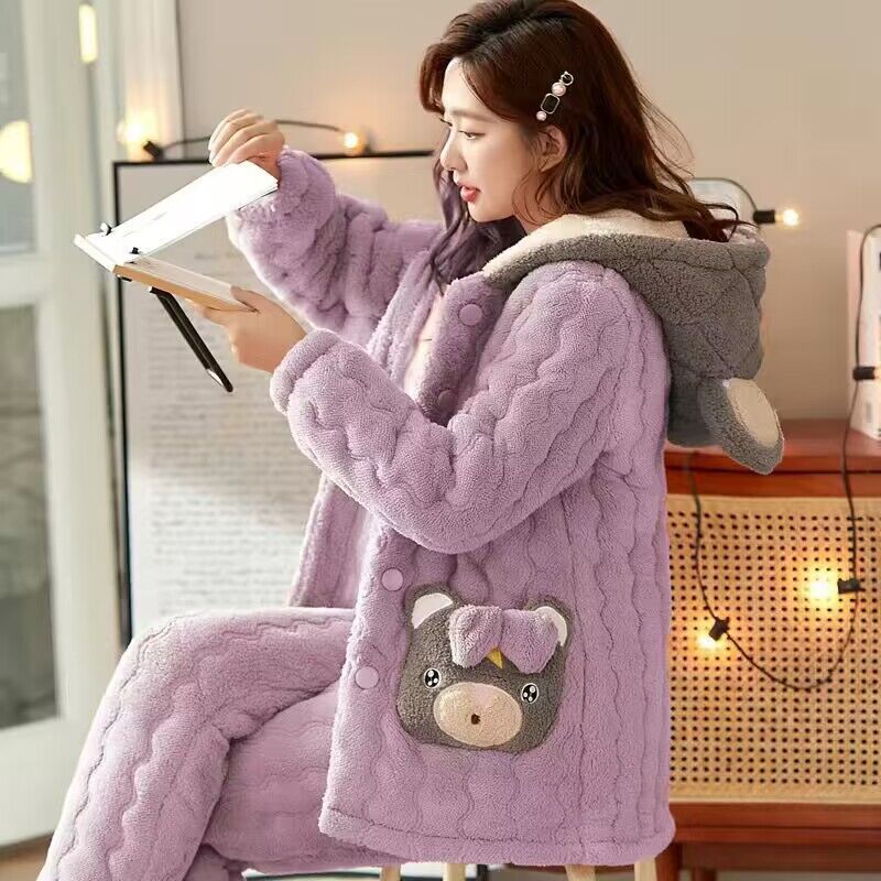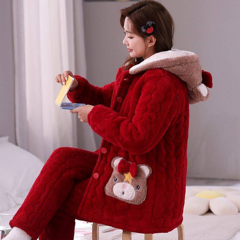 珊瑚绒睡衣女秋冬季加厚加绒三层保暖夹棉袄法兰绒大码家居服套装