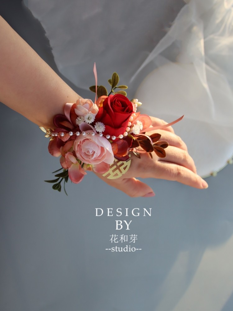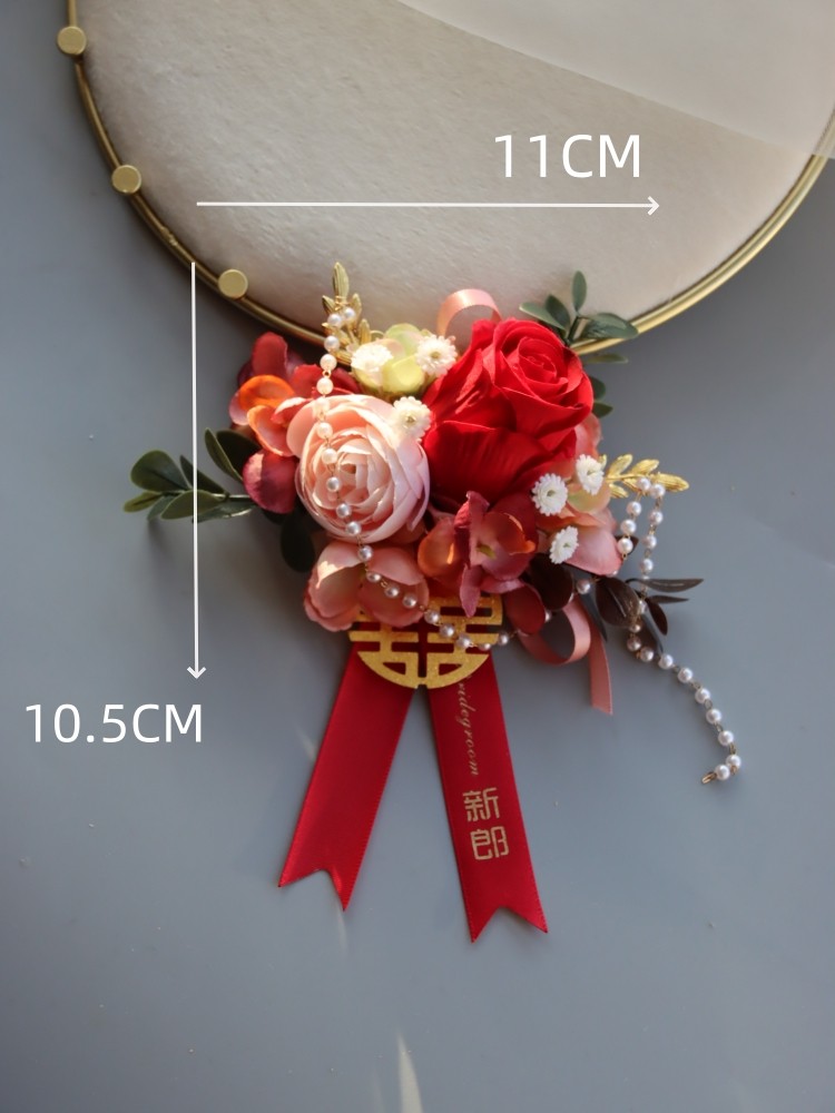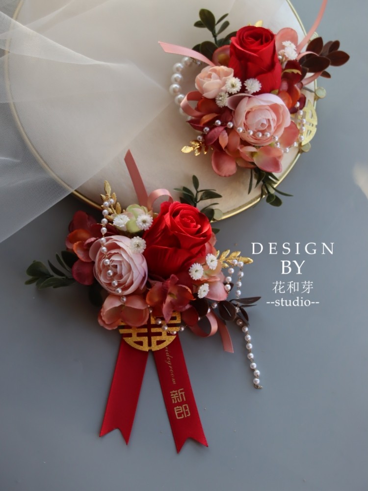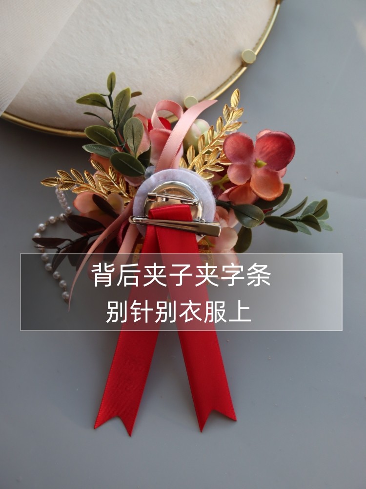 推荐理由:新中式原创 酒红花朵森系珍珠喜字新郎新娘手腕开业典礼结婚胸花