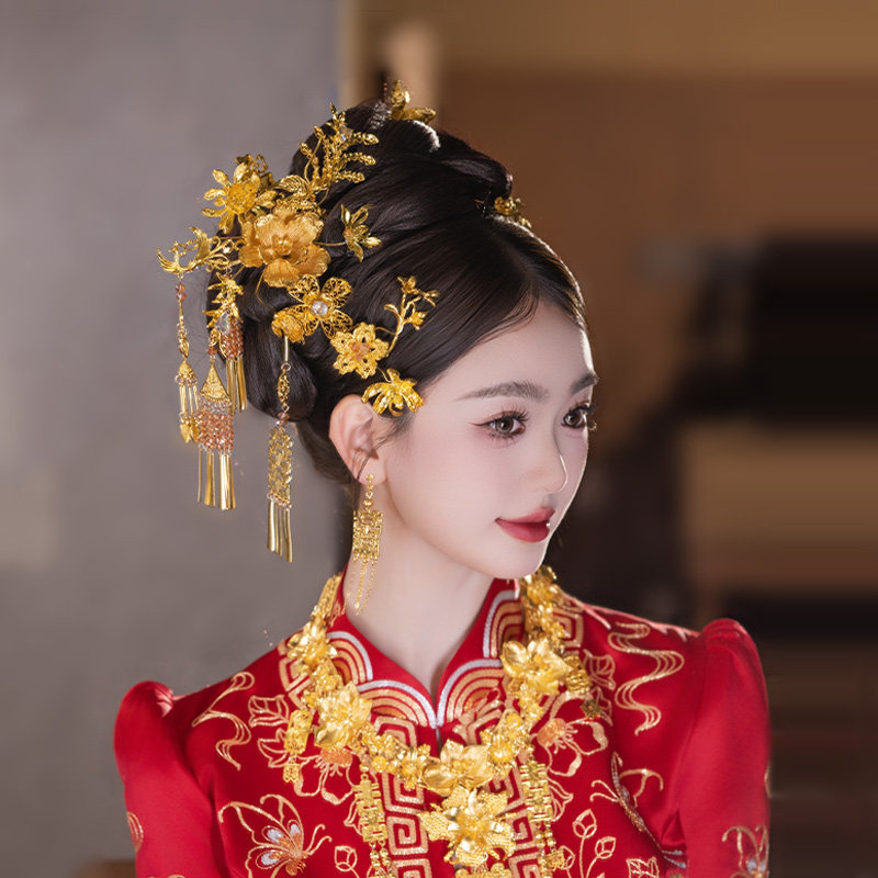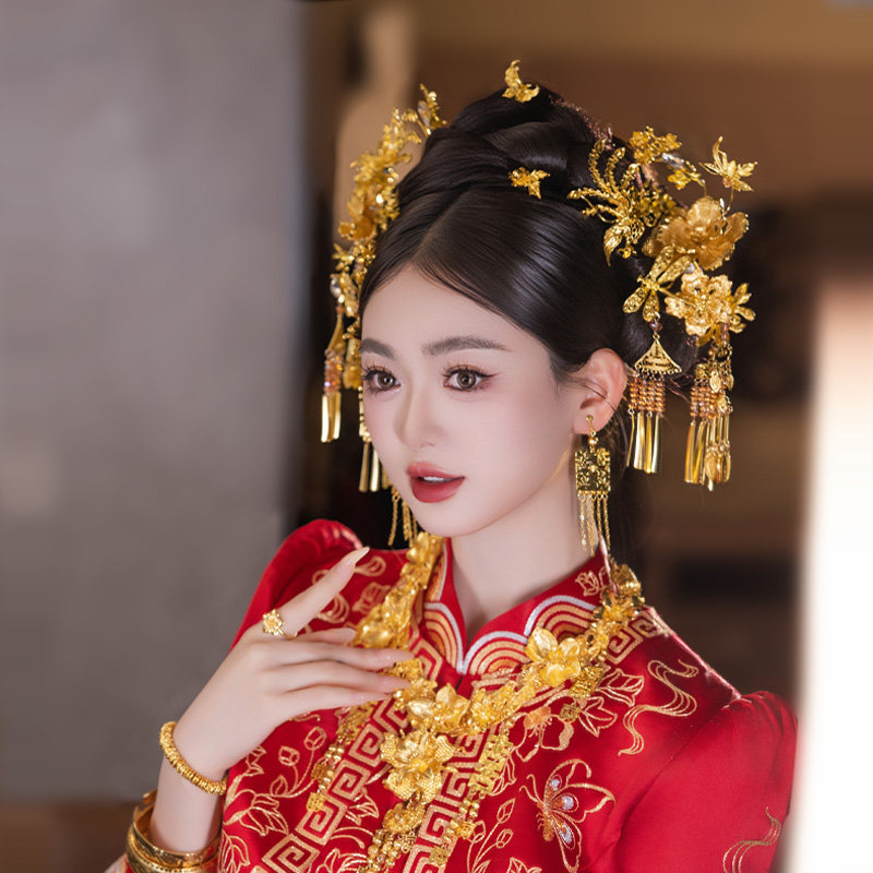 中式新娘结婚头饰金色发簪精致流苏减龄秀禾晨袍龙凤褂古风发饰品