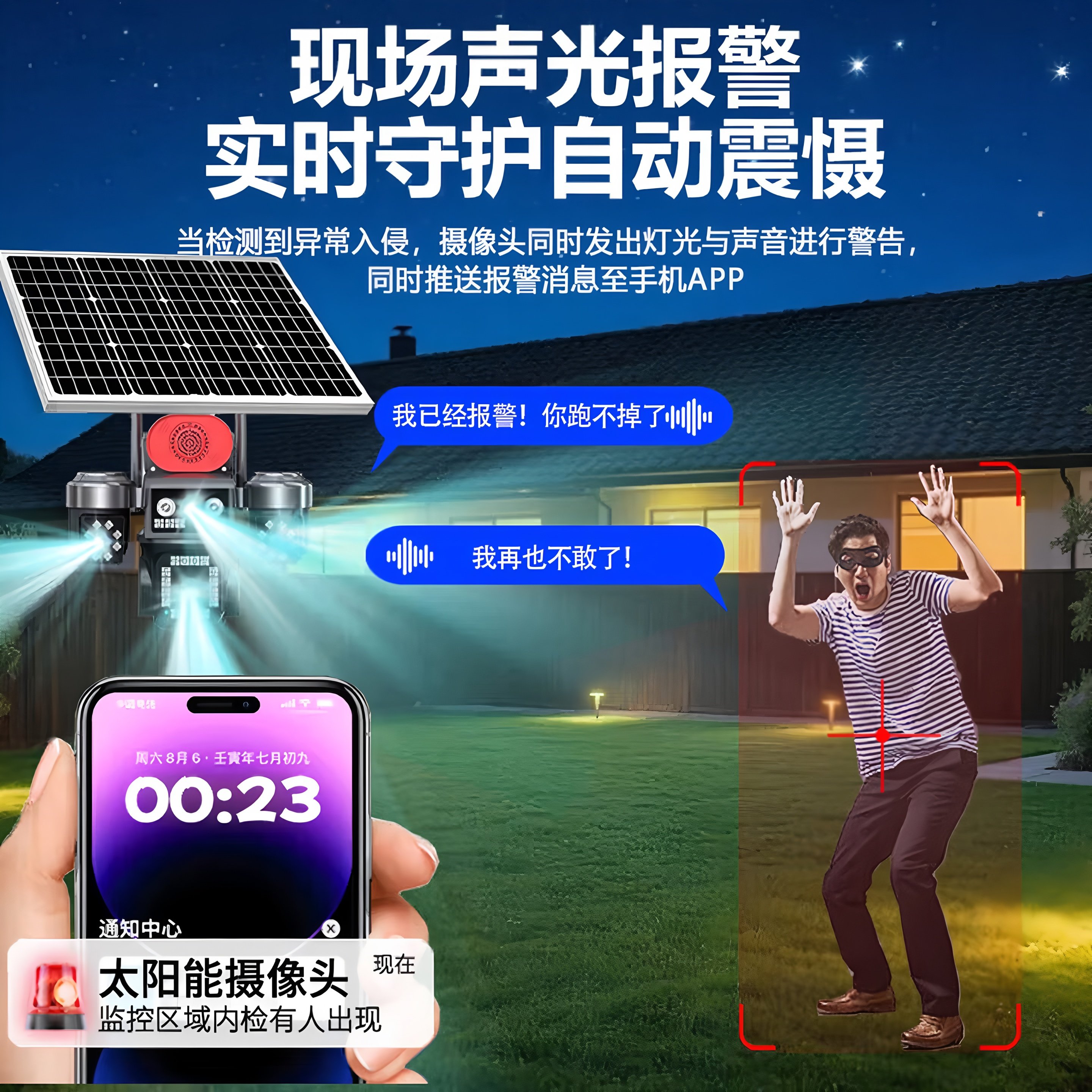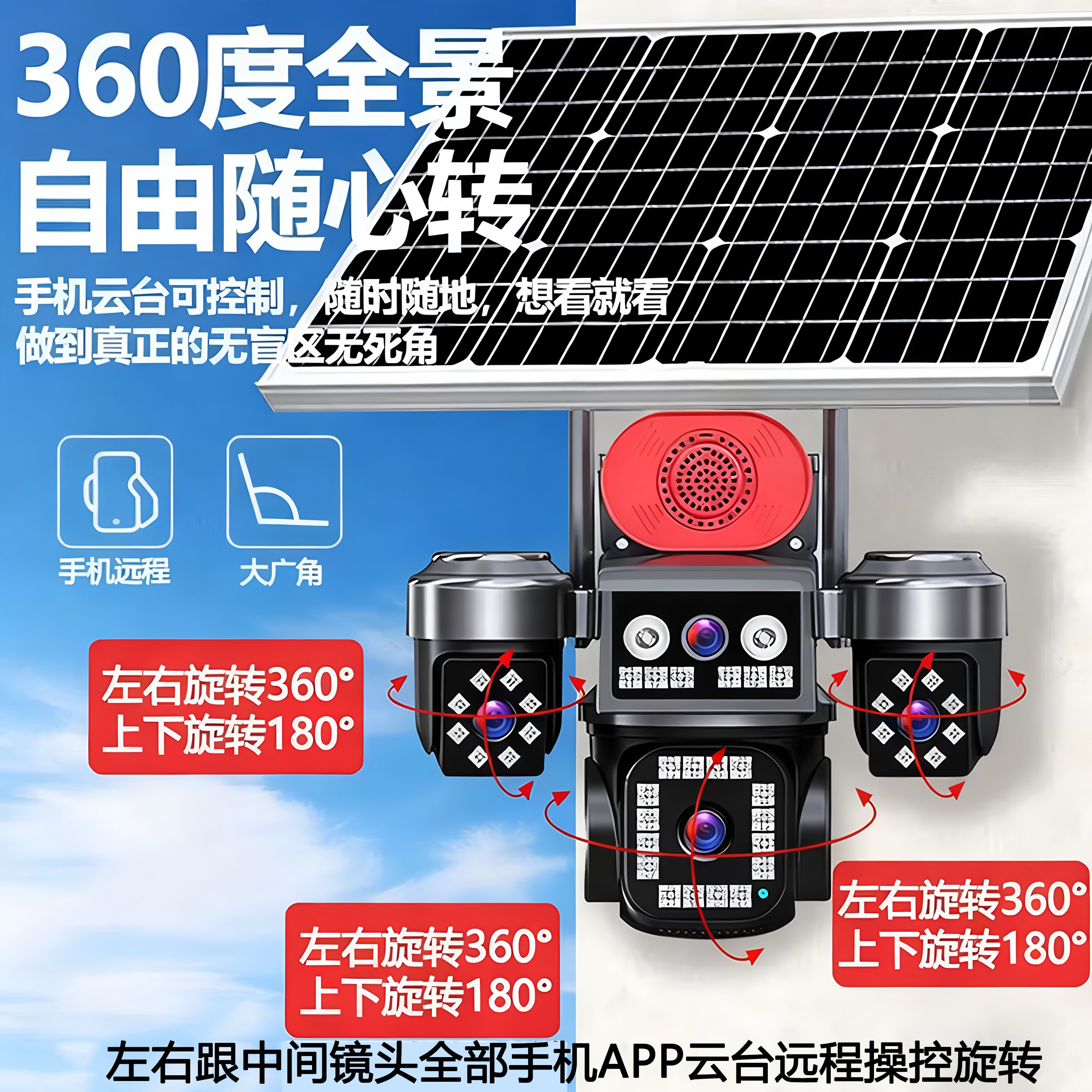 太阳能监控摄像头AOV录像四画面360旋转跟踪无死角无电无网免流量