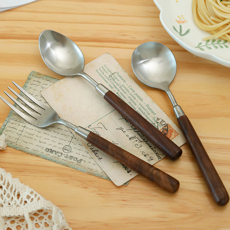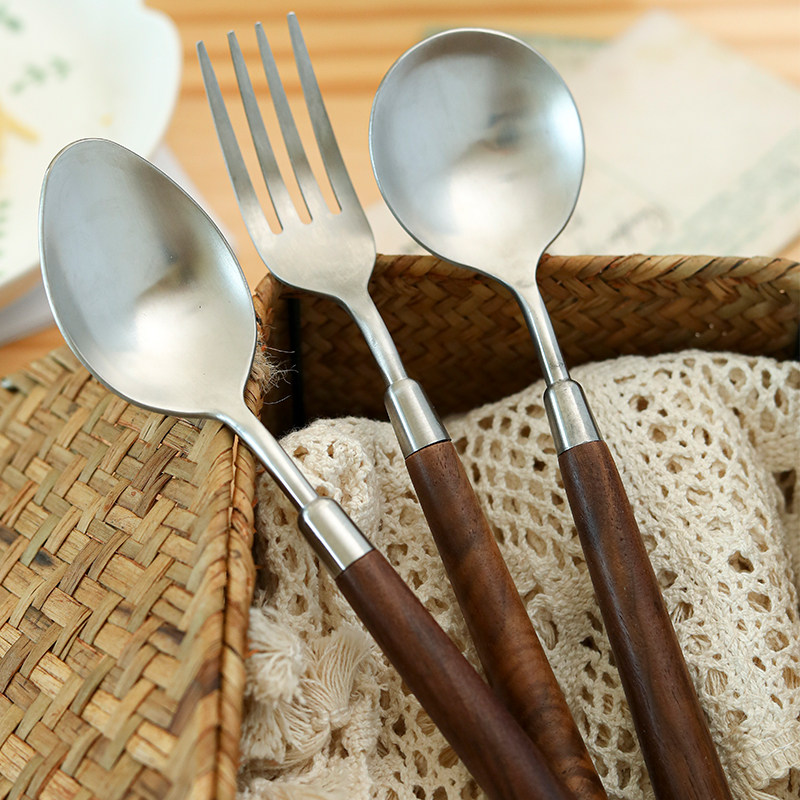 胡桃木实木西餐餐具餐勺汤勺餐叉牛排刀叉304不锈钢日式复古餐厅