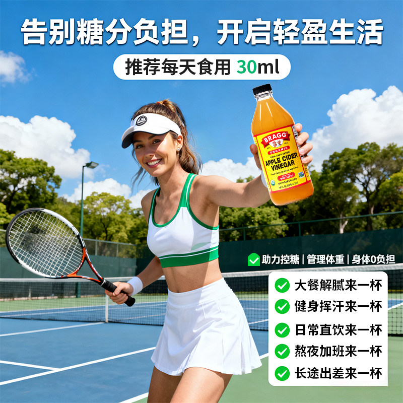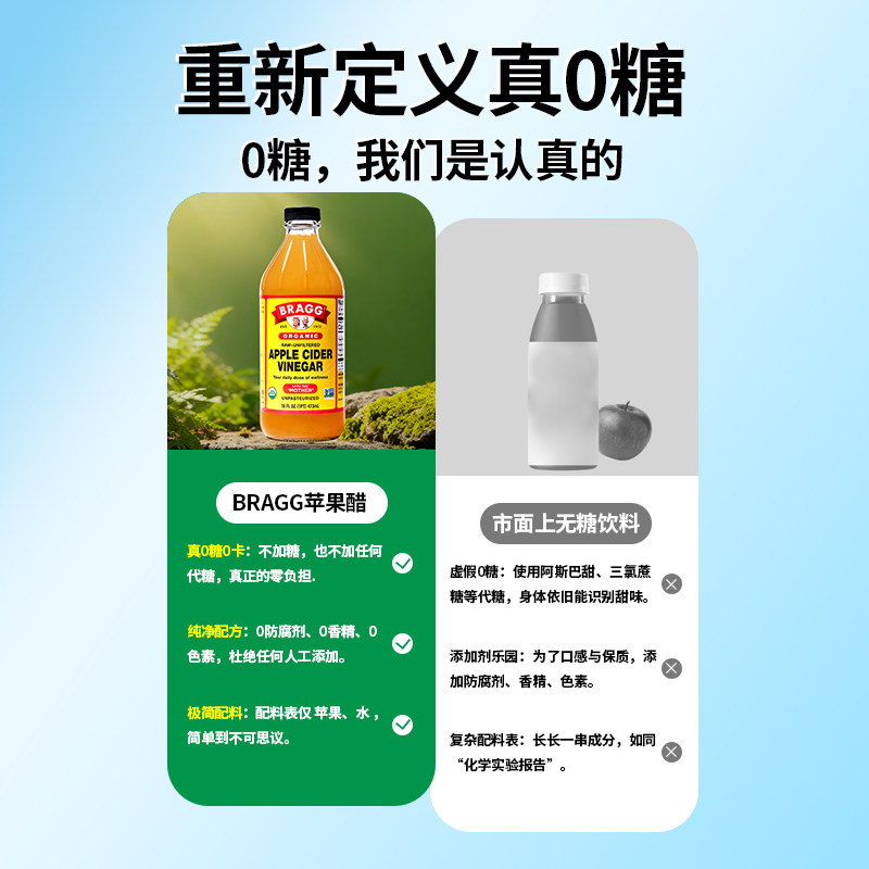 推荐理由:美国Bragg原装进口纯天然苹果醋无糖饮料浓缩原浆0糖0脂0卡0热量