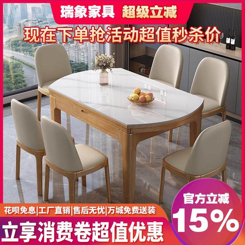 轻奢现代简约岩板餐桌家用小户型北欧实木可伸缩折叠方圆两用饭桌