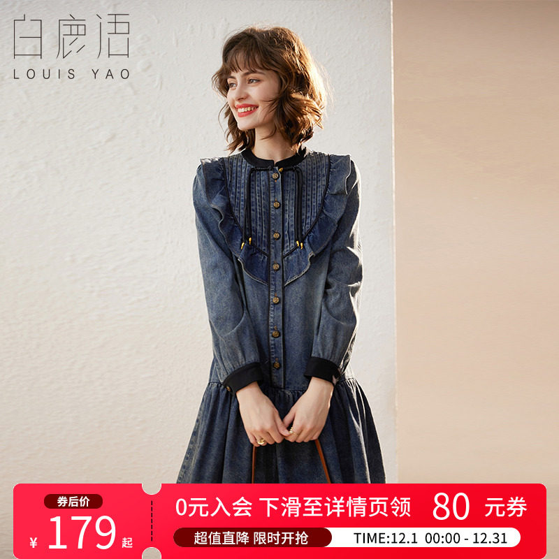 白鹿语撞色小立领盘扣洗水牛仔裙春款优雅风琴褶荷叶边连衣裙女