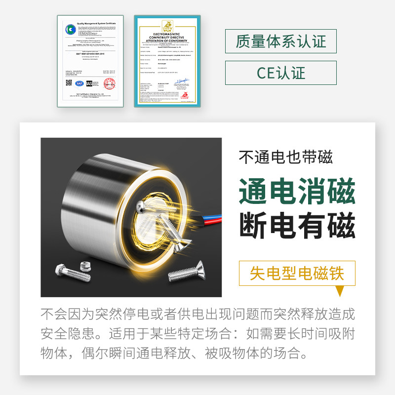 推荐理由:失电型通电消磁电磁铁强磁力电永磁吸盘直流12V24V圆形工业电吸铁
