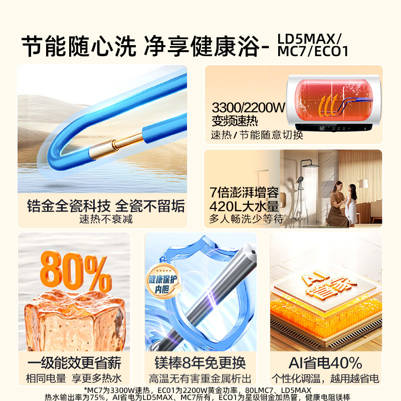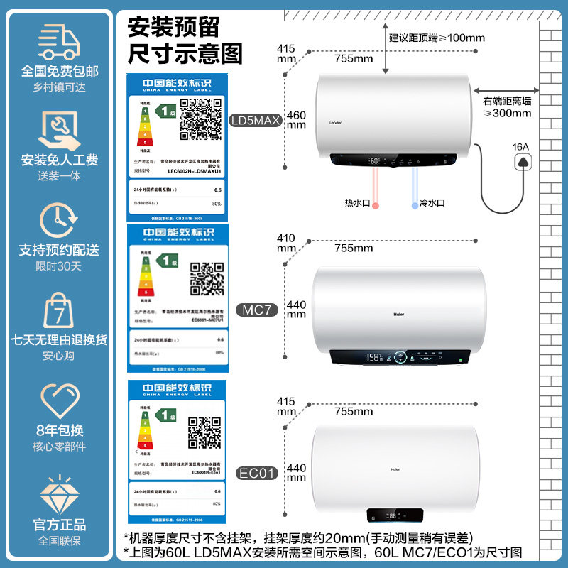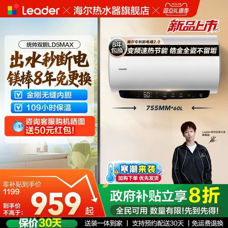 海尔出品统帅电热水器LD5MAX官方家用洗澡变频一级新60L出水断电