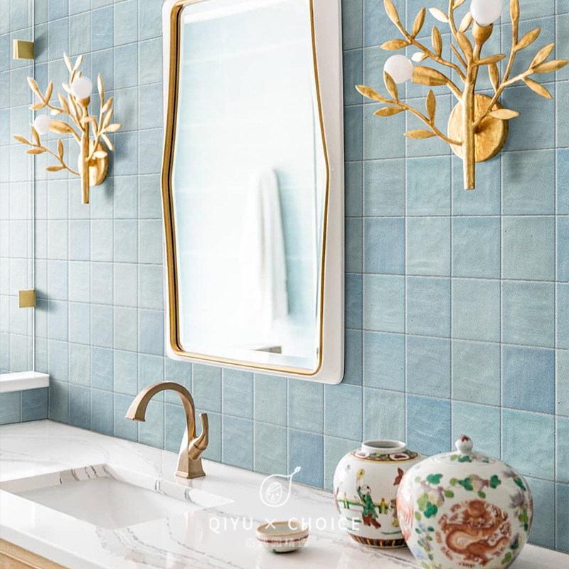 复古蓝色手工砖瓷砖卫生间浴室厨房小白砖奶茶店民宿餐饮背景墙砖