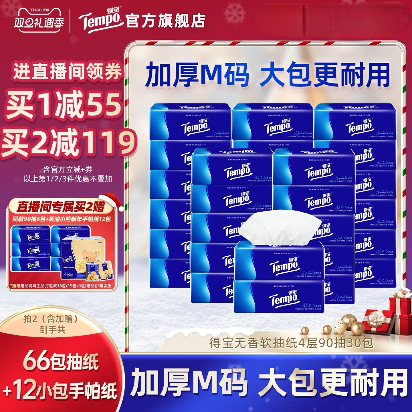 推荐理由:[直播间抢大额券]Tempo得宝纸巾无香软抽4层加厚抽纸巾90抽30包纸