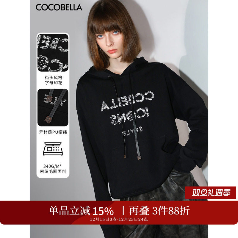COCOBELLA时尚字母印花连帽卫衣秋气质PU抽绳休闲帽衫SE619-2