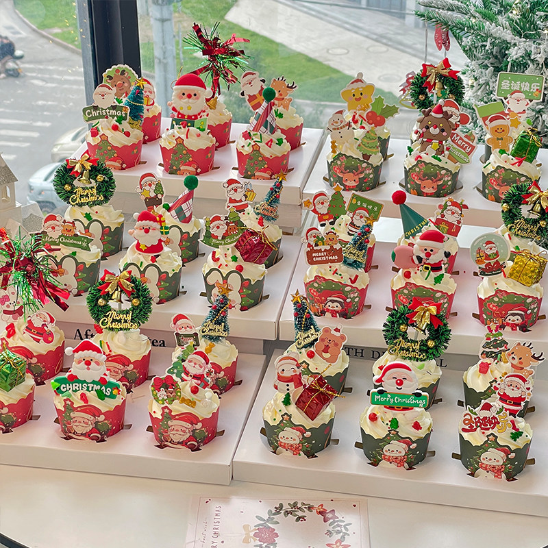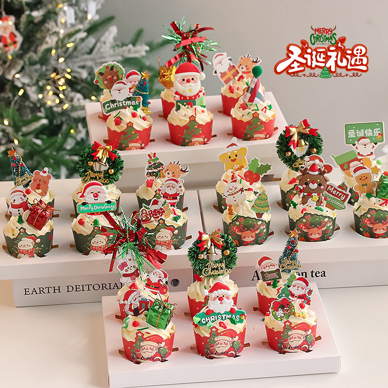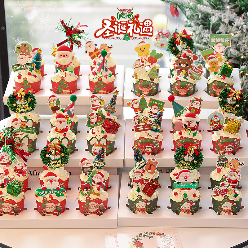 2025圣诞节纸杯蛋糕装饰插件老人雪人麋鹿杯子礼盒草圈雨丝插牌