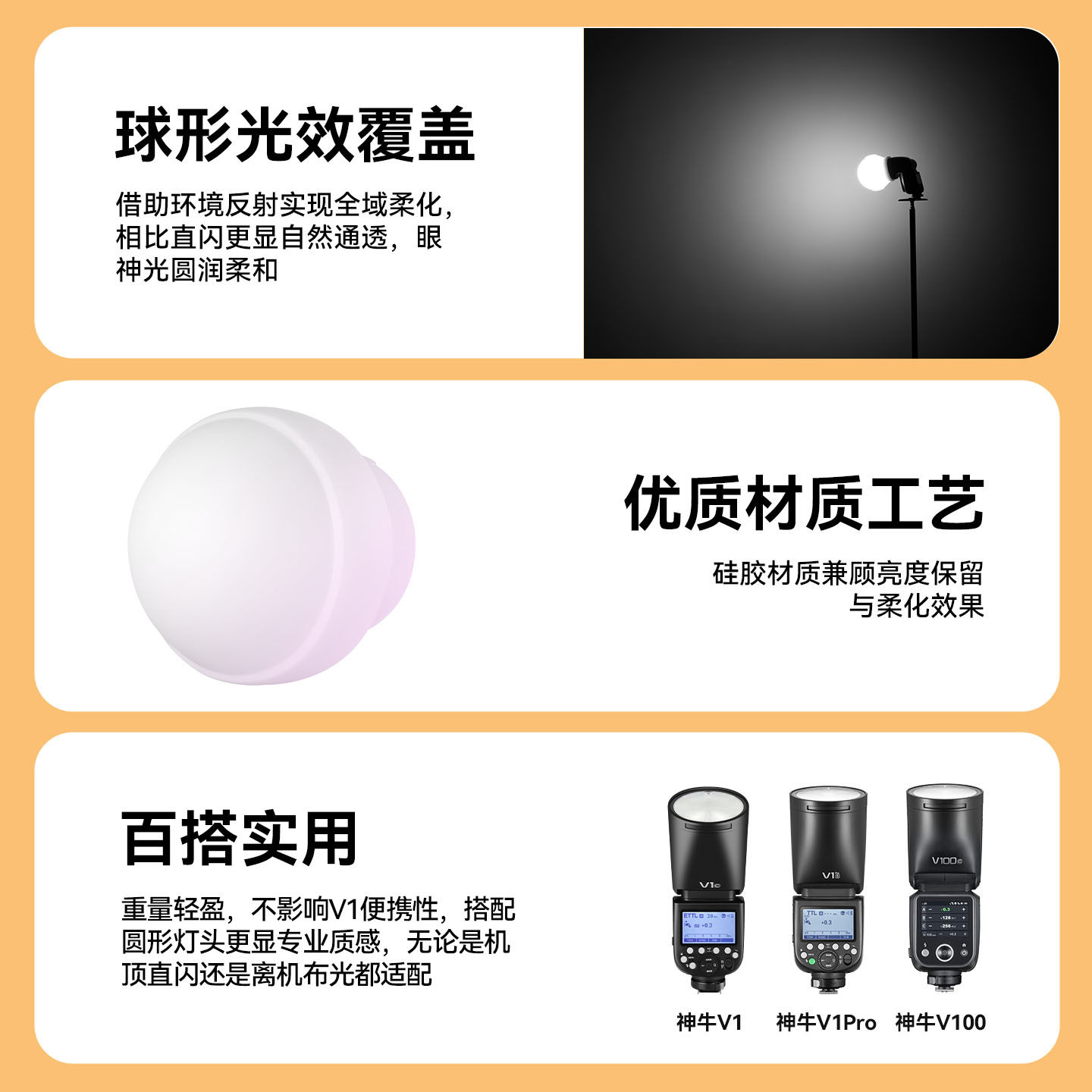 推荐理由:godox神牛V1/V1pro/V100闪光灯配件外拍灯机顶圆形灯头附件AK-R22柔光球V1系列圆头柔光盒v11滤色片柔光配件