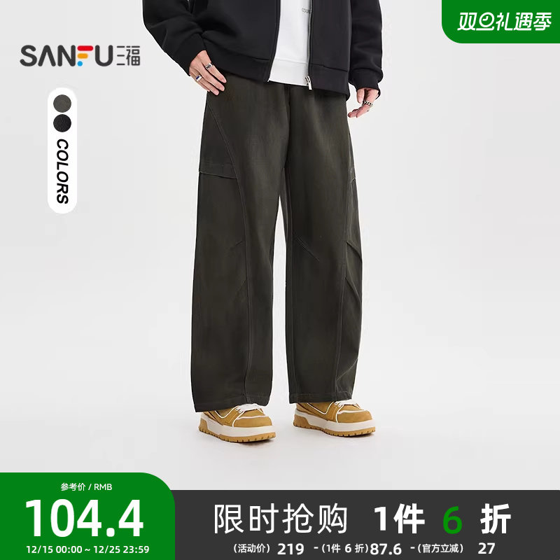 三福2025冬季男士脏脏分割结构弯刀休闲裤 街头阔版长裤510106