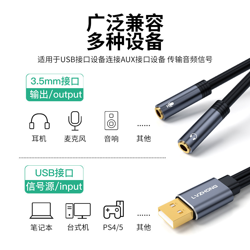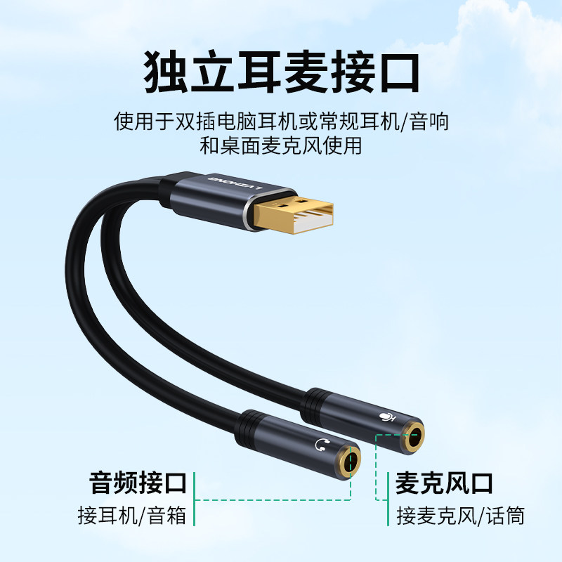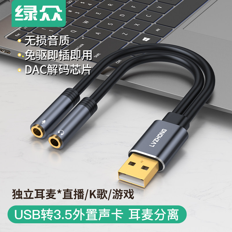 绿众USB外置声卡一分二台式机电脑笔记本外接口3.5音频耳机转换器