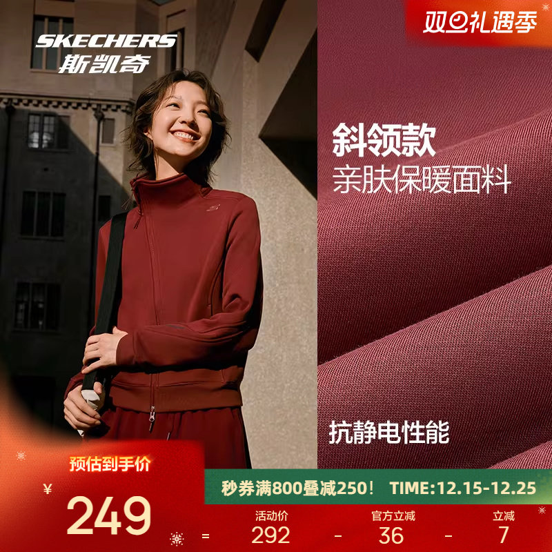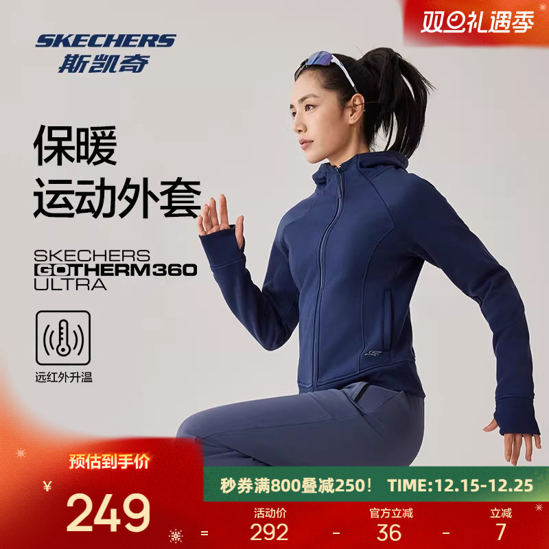 斯凯奇连帽拉链外套2025年秋冬新款女款加绒保暖正肩修身斜领茄克
