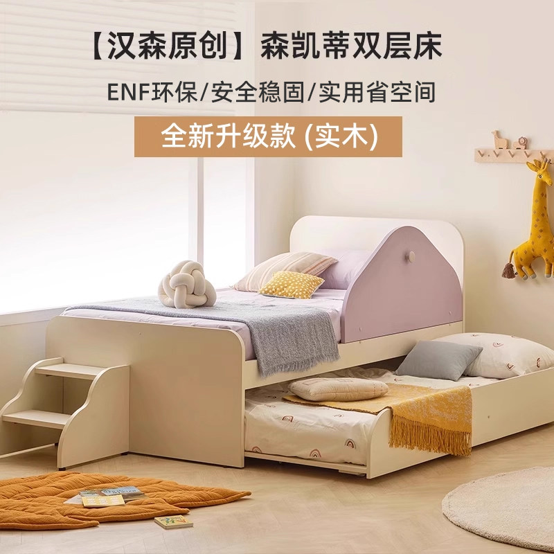 hanssem汉森儿童床实木带护栏现代简约省空间隐形双层抽拉子母床