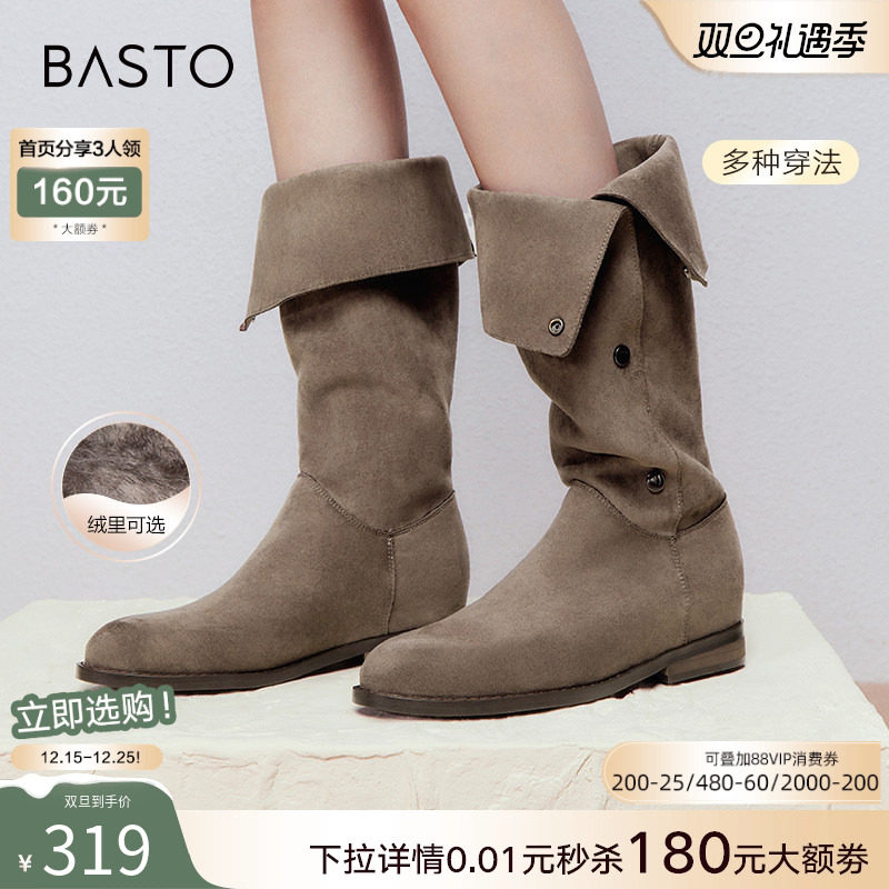 百思图冬季新款加绒西部靴弹力瘦瘦靴堆堆靴高筒女长筒靴W2671DG4