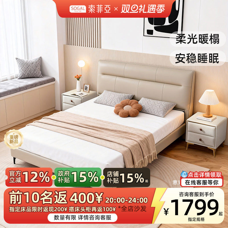 索菲亚正品轻奢简约风高级感双人床进口真皮超薄靠背小户型卧室