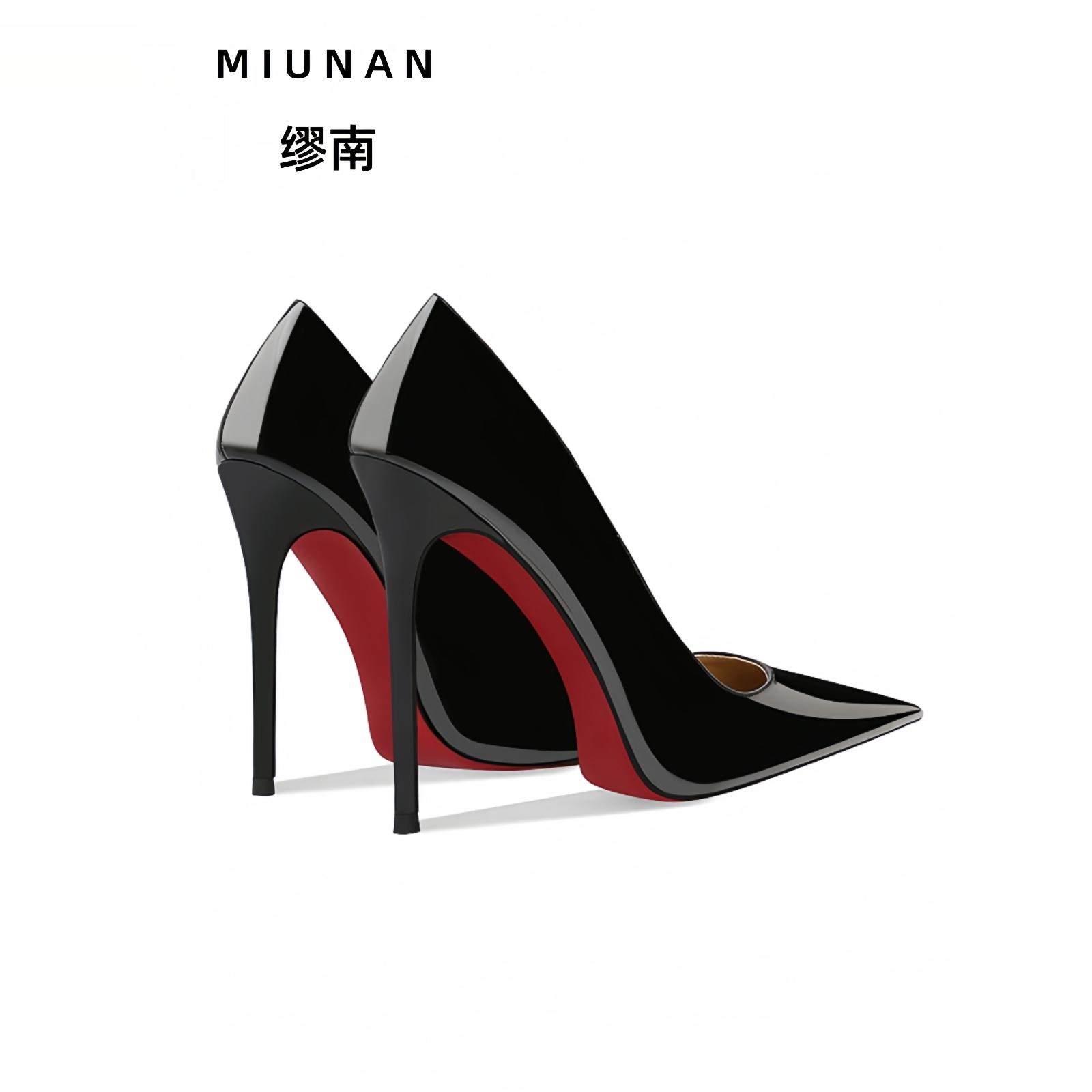 缪南黑色高跟鞋女2025新款漆皮细跟职业尖头高跟鞋气质高级不累脚