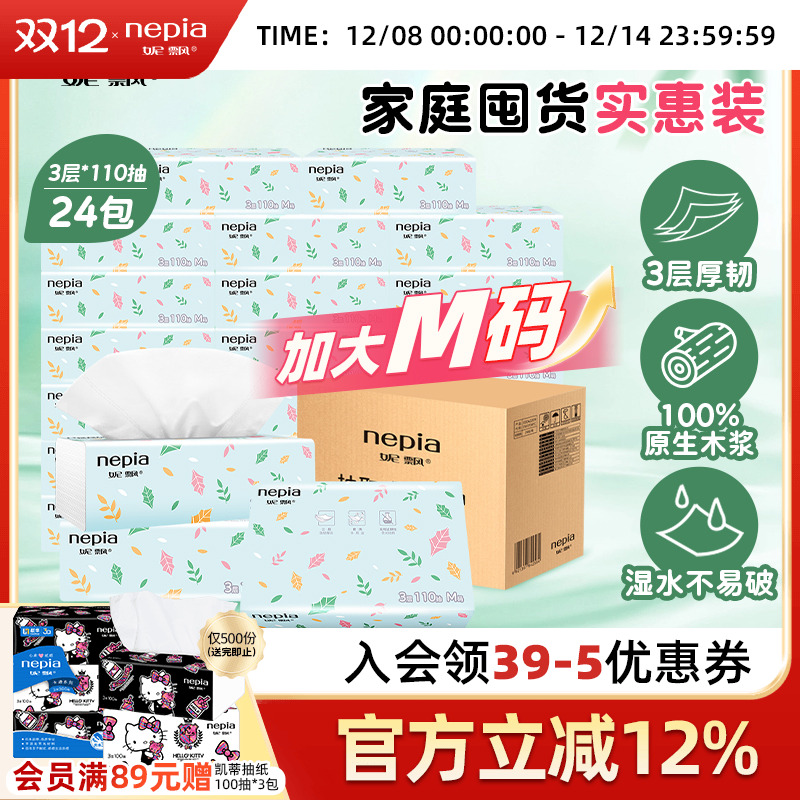 Nepia/妮飘整箱抽纸家用餐巾整箱柔韧加厚抽取式纸巾3层110抽24包
