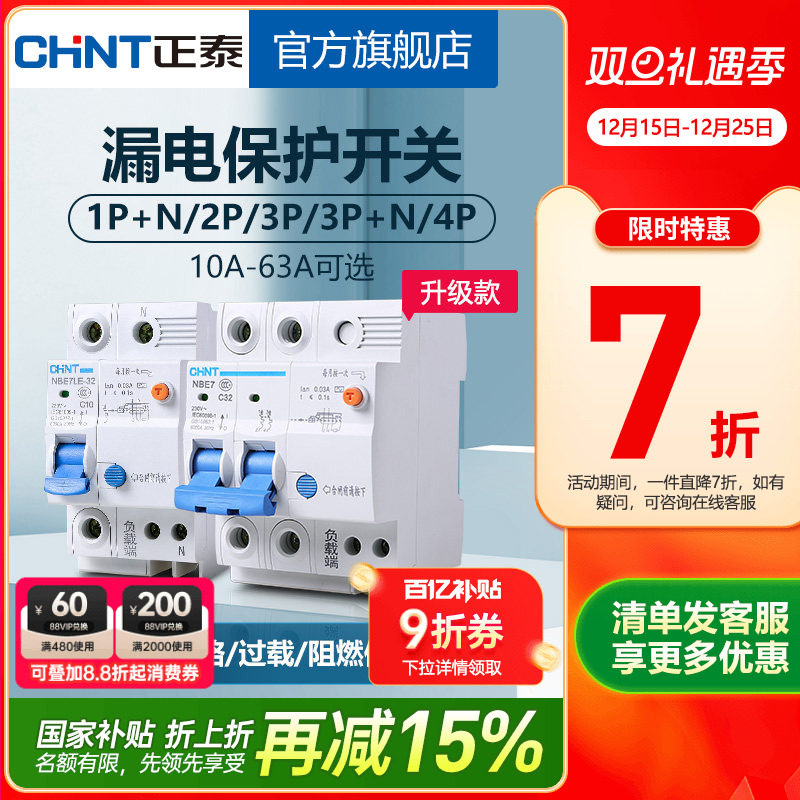 推荐理由:正泰空气开关NBE7家用2P漏保断路器63A总空开空调电闸带漏电保护