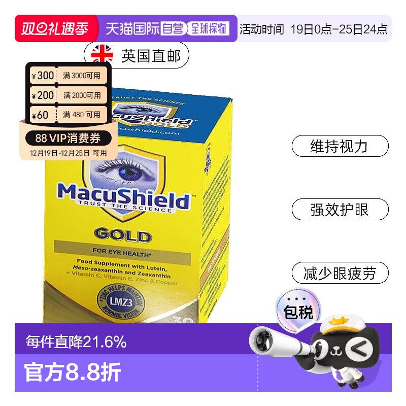 欧洲直邮英国MACUSHIELD加强版缓解眼疲劳叶黄素锌维生素胶囊90粒