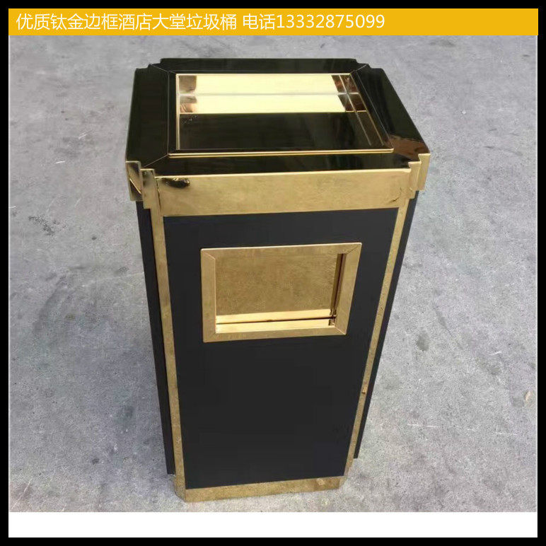 此款垃圾桶带烟灰缸,不锈钢镀钛包边,桶身为铁烤漆。适用于酒店、商场、机场、写字楼等。