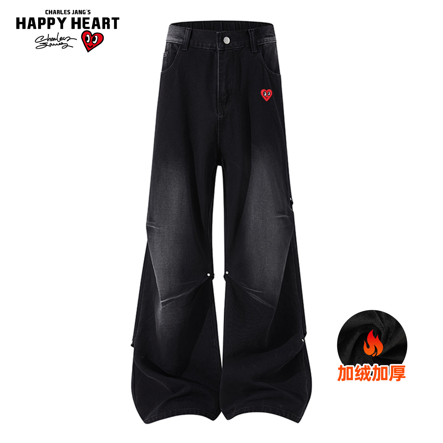查尔斯桃心美式褶皱铆钉牛仔裤男冬季加绒加厚宽松直筒阔腿长裤子