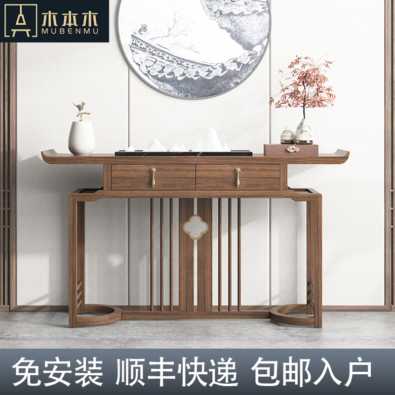 新中式玄关桌条案实木胡桃木色案台入户门厅玄关架轻奢中式老榆木