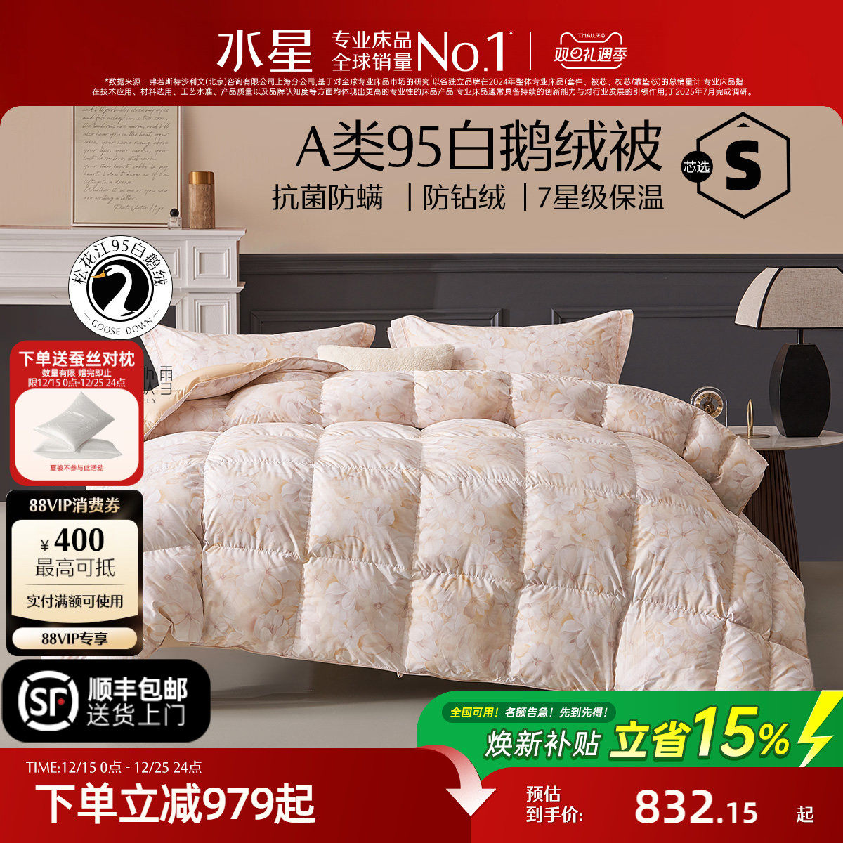 水星家纺羽绒被95白鹅绒冬被加厚保暖抗菌蓬松被子春秋被结婚被芯