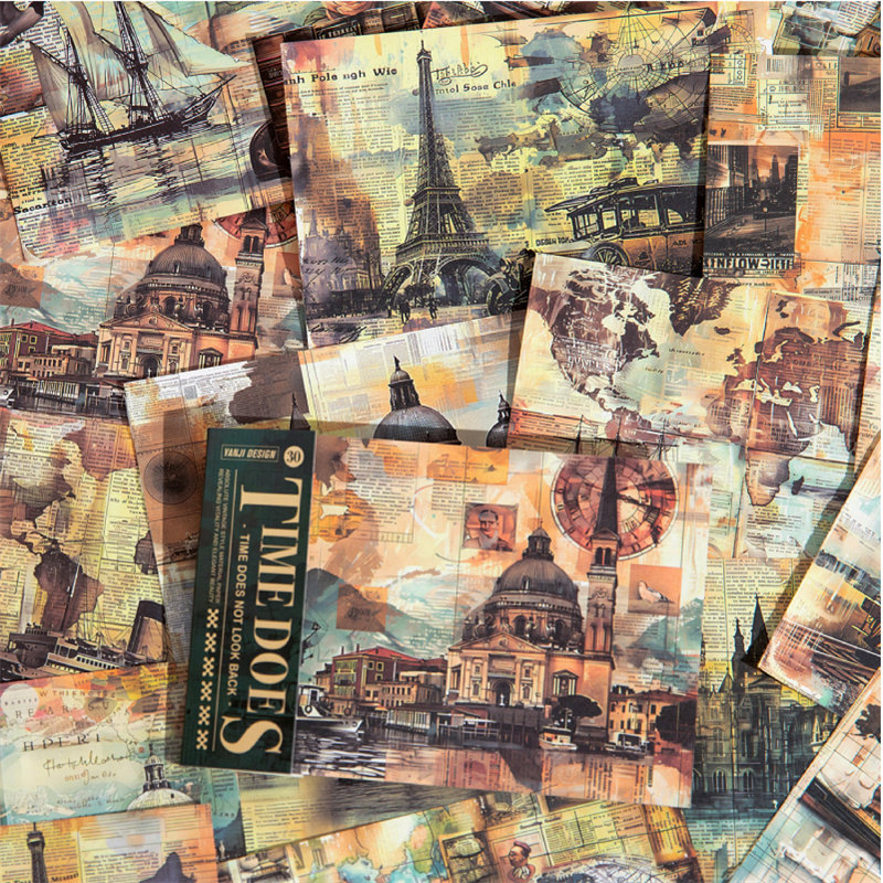 M|时光不回首素材纸 复古蝴蝶秋叶船只纹理白牛皮纸30张入无重复