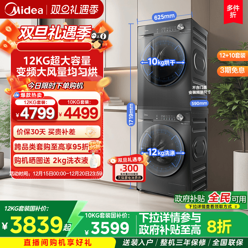 【全民补贴】美的洗烘套装12/10KG滚筒洗衣机变频热泵式烘干机36T