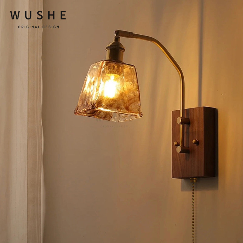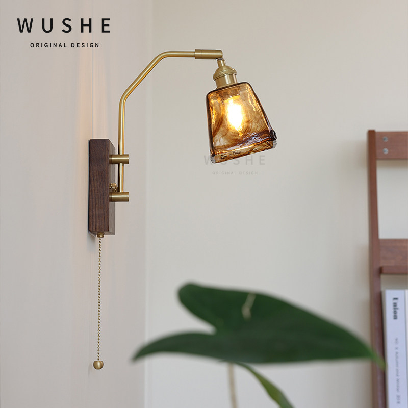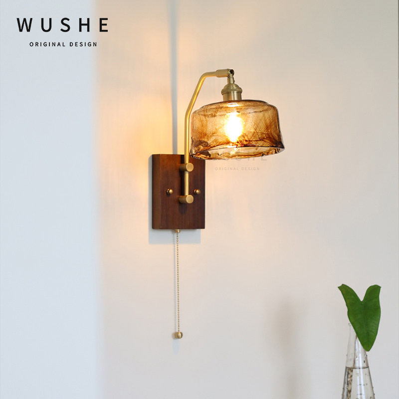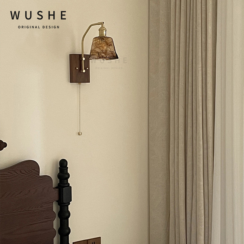 夜光杯法式复古卧室床头壁灯墙灯中古客厅民宿设计师拉线黄铜灯具