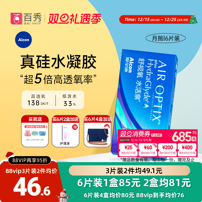 爱尔康视康舒视氧水活泉月抛3片近视隐形眼镜硅水凝胶高透氧运动