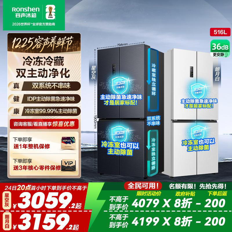 推荐理由:【526十字款】容声516L双净双系统十字双开四门家用无霜嵌入冰箱