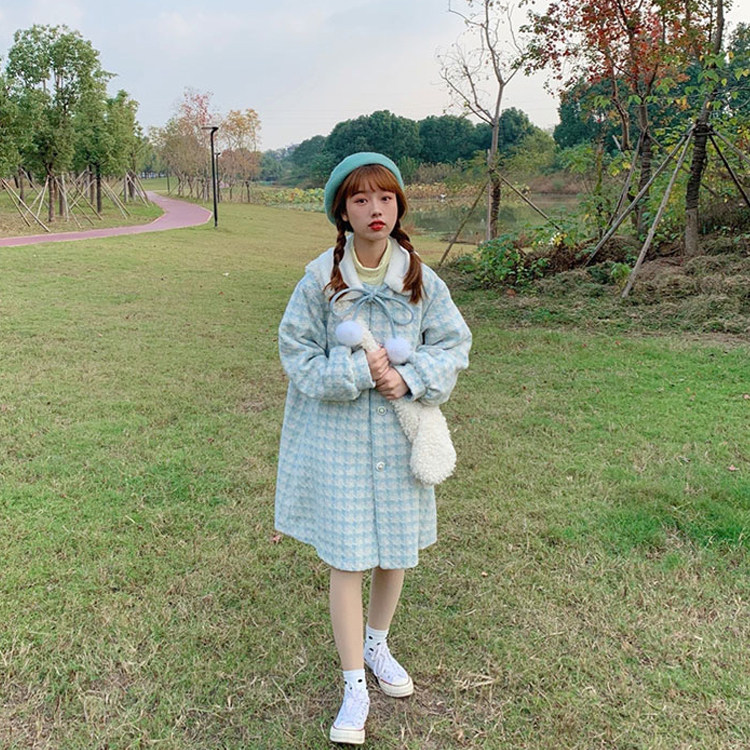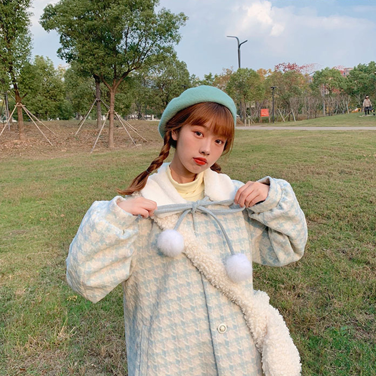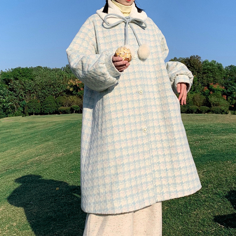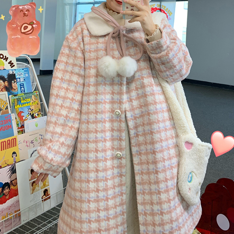 推荐理由:蛋包饭餐厅_千鸟格大衣女秋冬日系可爱甜美中长款学院风呢子外套
