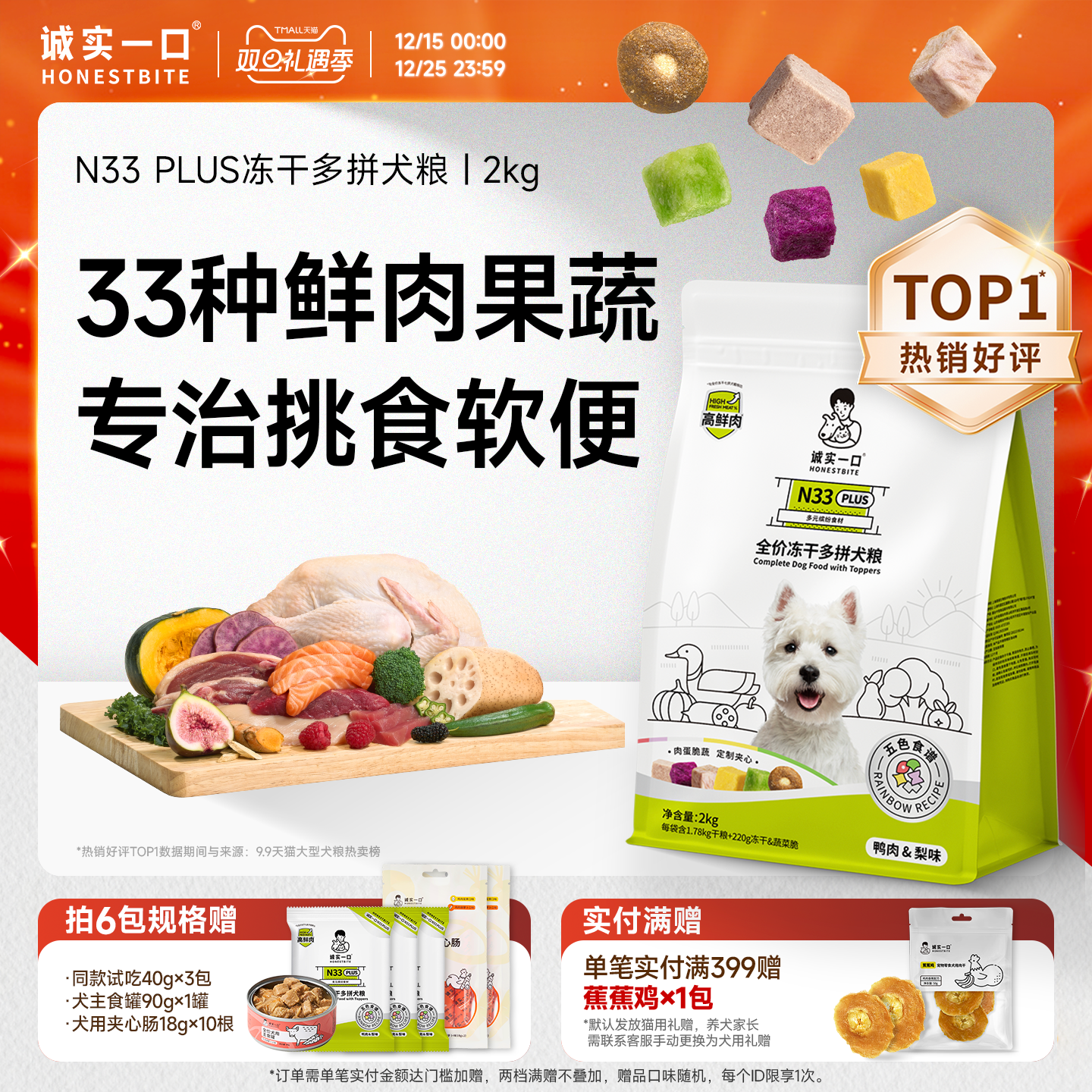 诚实一口N33 PLUS冻干多拼犬粮鸭肉梨幼犬中大型犬小型犬鲜肉狗粮