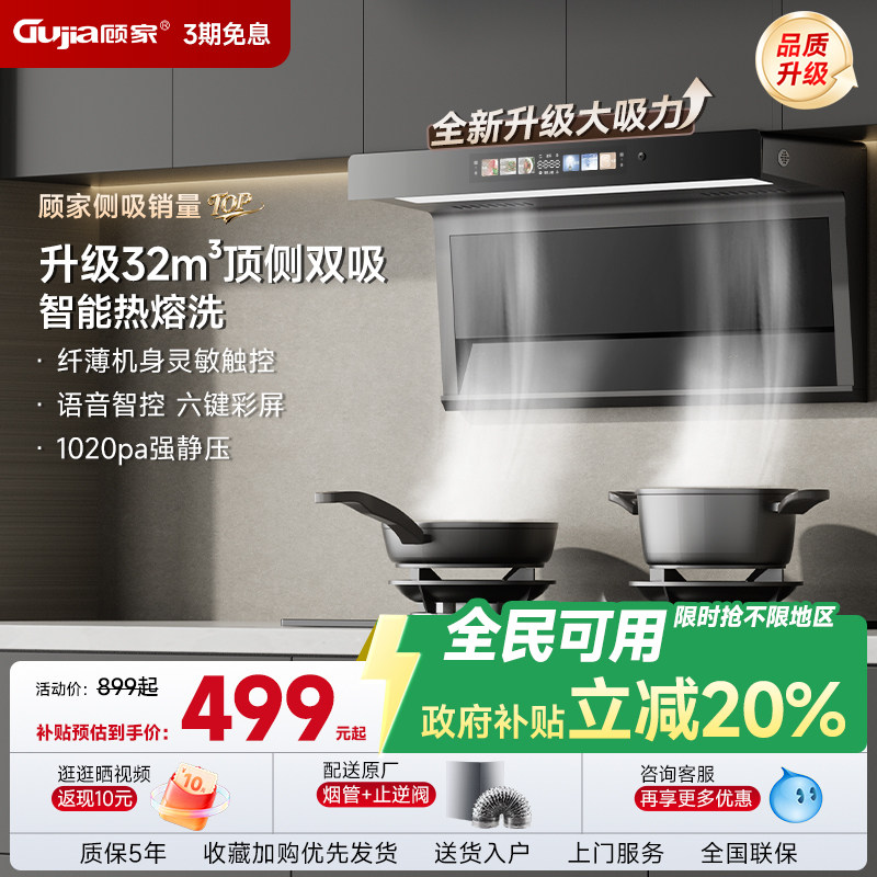 顾家抽油烟机家用厨房大吸力油烟机顶侧双吸变频7字小型吸烟机