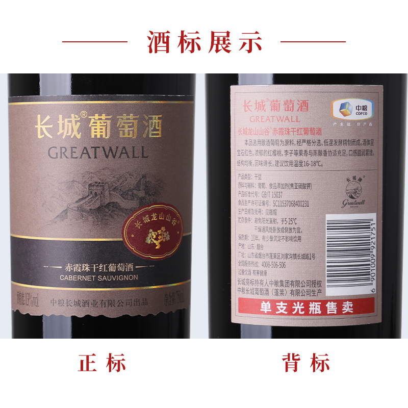 中粮长城干红葡萄酒红酒山谷高级赤霞珠750ml×6瓶整箱送礼婚宴,