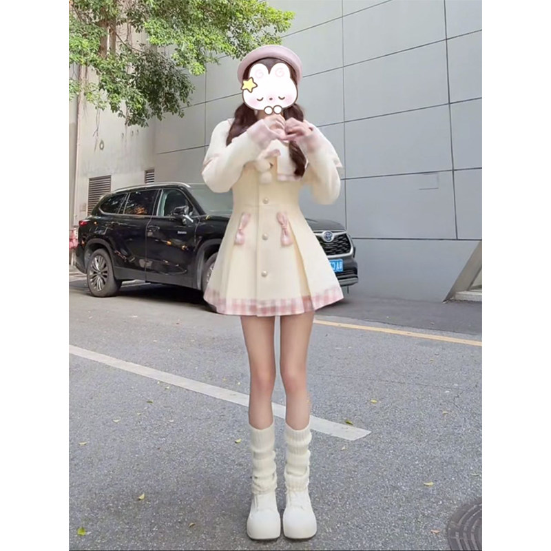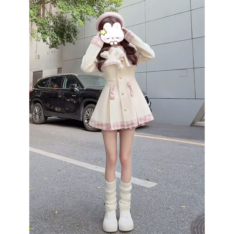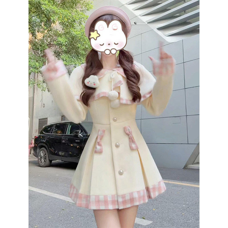 格子毛呢大衣奶白斗篷两件套蝴蝶结甜美少女感套装洛丽塔lolita裙