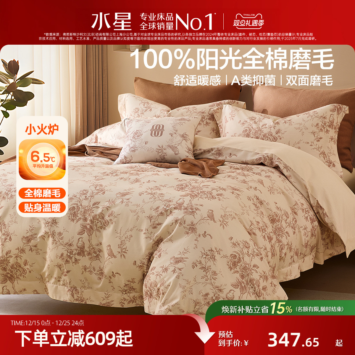 水星家纺全棉磨毛四件套纯棉抗菌加厚保暖床上用品秋冬天床单被套