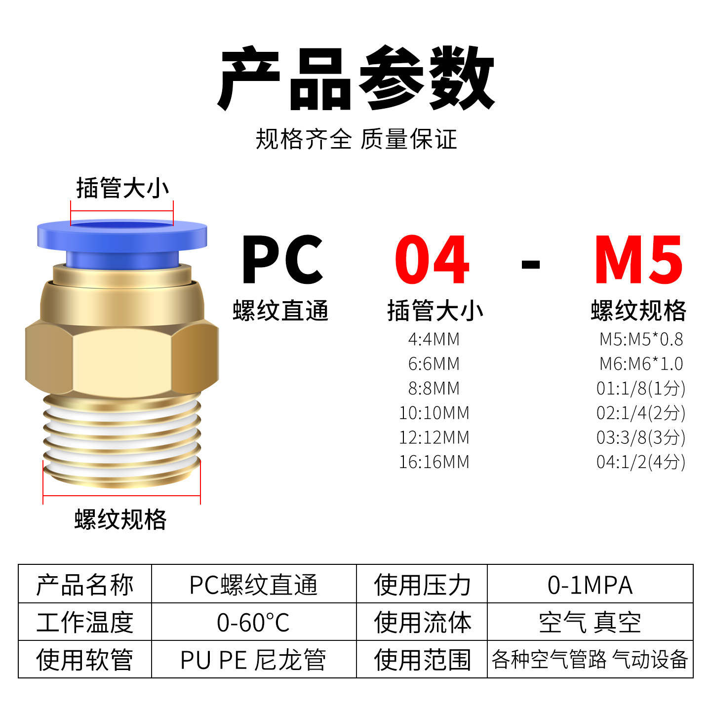 推荐理由:直通螺纹气管气动快插快速接头PC4/6/8/10/12/16-M5/01/02/03/04