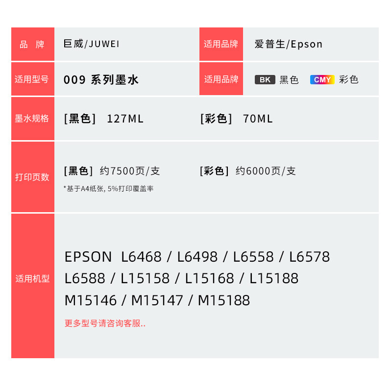 适用爱普生009墨水颜料L6468 L6498墨仓式多功能一体机L6558 L6578 L6588喷墨打印机彩色墨水非原装009BKCMY