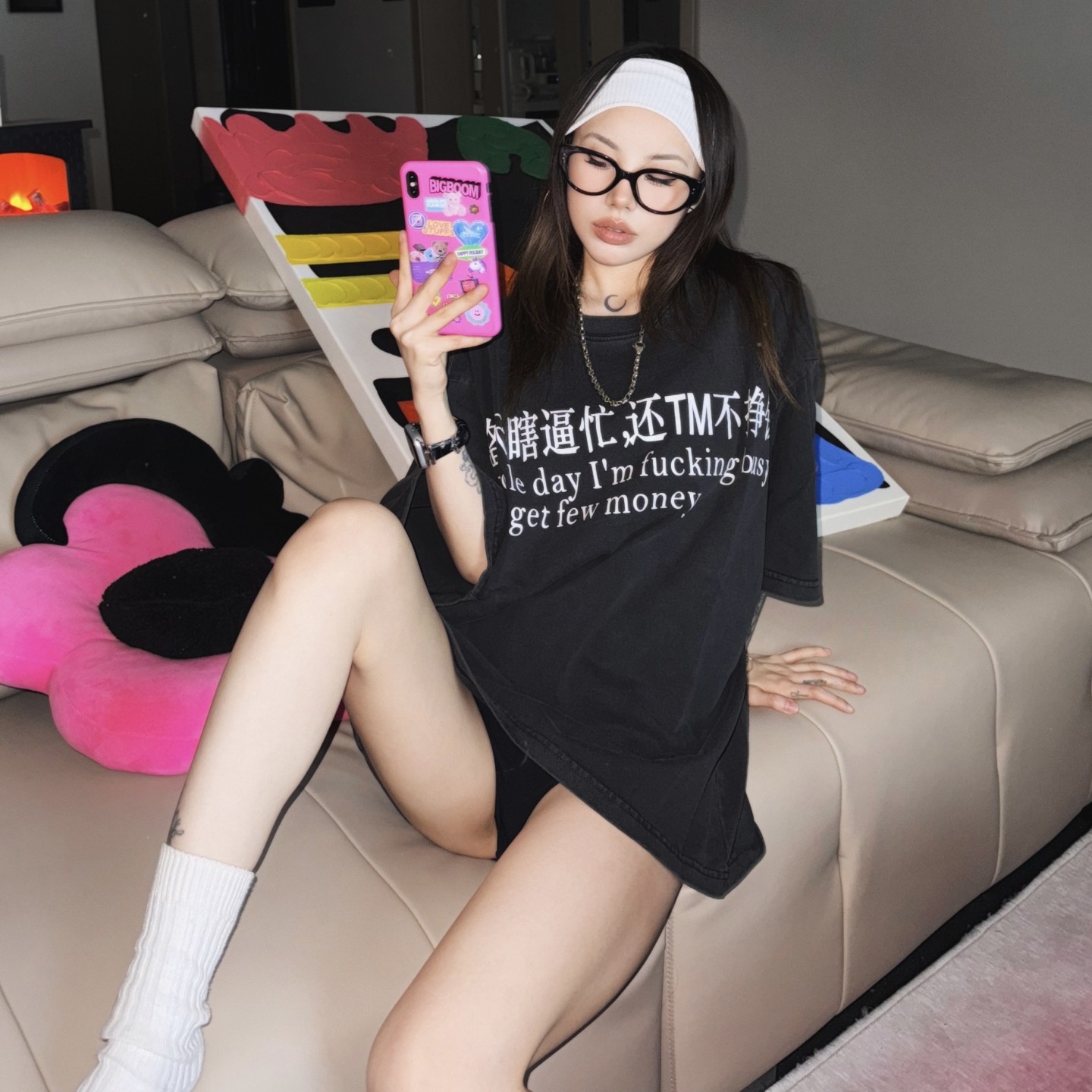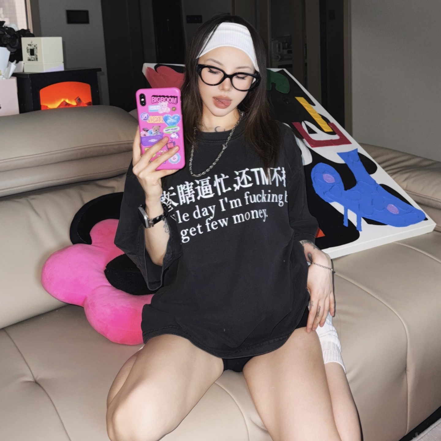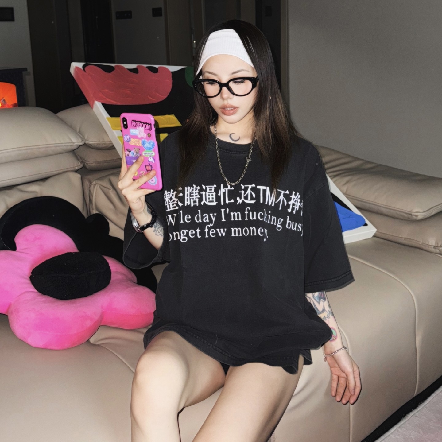 推荐理由:PRAYING趣味印花整天瞎逼忙还不挣钱做旧水洗短袖美式休闲男女T恤