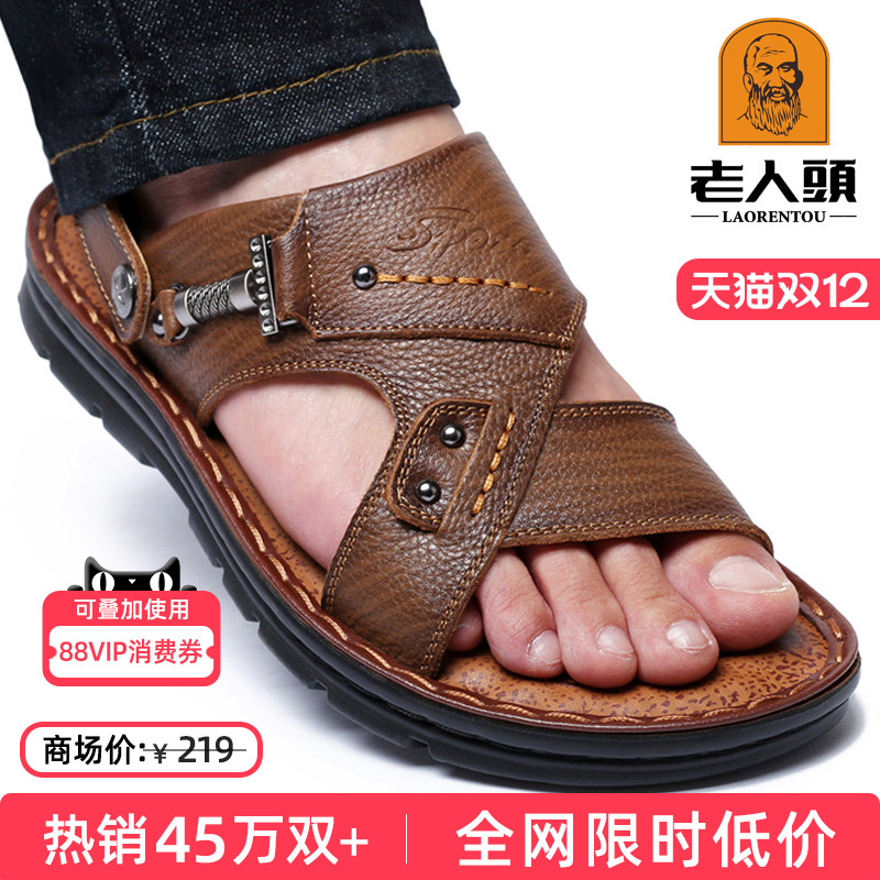 老人头凉鞋男2025夏季牛皮休闲外穿沙滩鞋真皮防滑中老年爸爸拖鞋