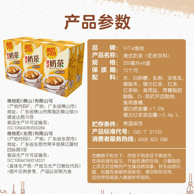 推荐理由:维他港式奶茶250ml*12/24盒经典港味系列苗条装奶茶饮料家庭囤货