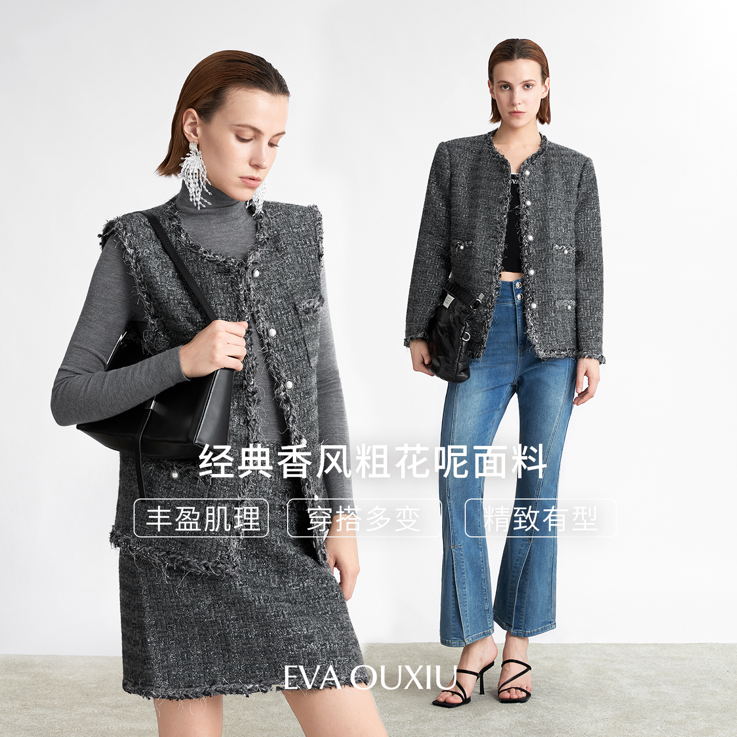 EVAOUXIU高智感老钱套装25秋小香风设计感休闲马甲+西装外套+半裙
