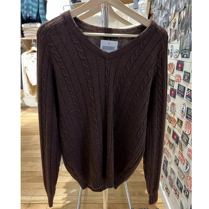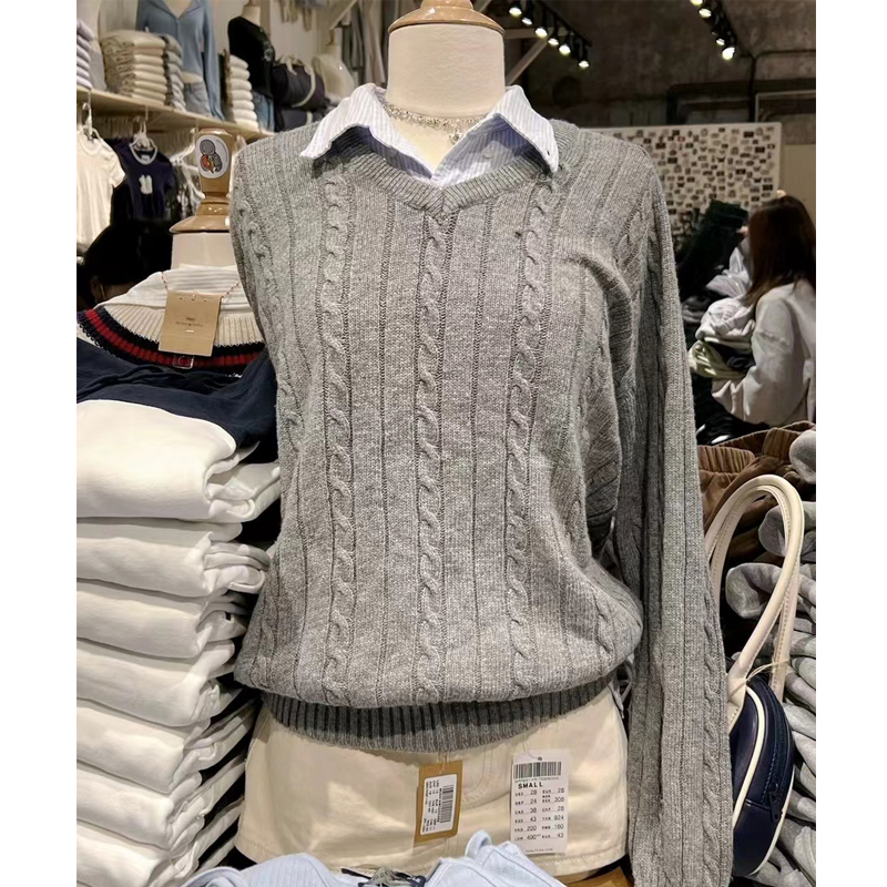 Brandy Girl美式复古V领麻花灰色针织衫bm风宽松套头毛衣外套女